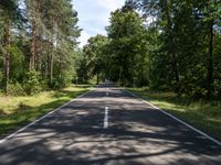 This is an image of a straight road in Berlin, Germany. The asphalt road stretches into the distance, surrounded by a beautiful landscape of forests and clear skies. The sun creates hard shadows on the road and the surrounding nature. This photo captures a sunny day in Berlin, showcasing the natural beauty and peacefulness of the area.