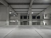 A dark, straight road in Berlin illuminated by the lights of modern architecture. The profile of the city's urban design is highlighted against an open space. A POV view of a concrete street at night in Europe's urban landscape.