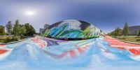 a man is riding on a skateboard down a slope covered in colorful paint,