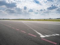 This is an image of an empty airport runway at Tempelhof Airport in Berlin, Germany. The clear blue sky with white clouds creates a beautiful backdrop for the asphalt road surface. The open space and grassy fields surrounding the runway provide a peaceful and natural landscape. This photo captures a typical day in Europe, with the airport serving as a recreational area for nature lovers. The image conveys a sense of tranquility and open skies, making it an ideal choice for travel and outdoor-related content.