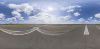 A wide, empty road in Berlin's Tempelhof airport area. The clear sky and white clouds create a serene landscape. The road stretches towards the horizon, surrounded by open spaces and nature. A perfect day for recreation and exploration in Europe's urban design capital.