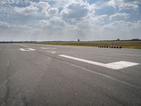 This is an image of an airport runway in Berlin, Germany. The asphalt road surface is lined with multiple red containers. The cloudy sky above creates a dramatic backdrop. The image captures a clear day in Europe, showcasing the open space and recreational nature of Tempelhof Park. The runway represents a key infrastructure in the city, serving both airfield and airport needs. This photo highlights the intersection of transportation and recreation in Berlin, Germany.