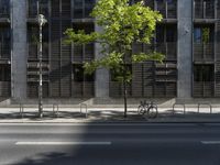 This is an image of a modern architecture in the vibrant city of Berlin, Germany. The photo captures the unique blend of old and new, with traditional tree-lined streets and modern office buildings. The yellow lines and hard shadows from the urban design create a dynamic snapshot of city life. The image showcases the bustling business district and metropolitan area of Berlin, highlighting the architecture and road infrastructure. This photo represents the urban and cosmopolitan atmosphere of the European city.