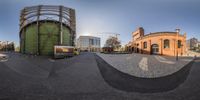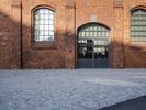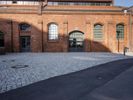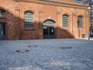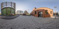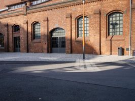 A panoramic view of a historic brick building in Berlin's town square. Surrounding buildings create a charming neighborhood ambiance. Cobblestone road leads to the beautiful facade. A perfect blend of historic architecture and urban charm.