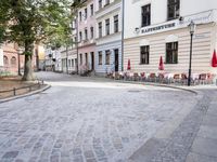 Classic architecture in Berlin's town square. Cobblestone walkways and stone-paved sidewalks complement the charming European town. A bustling public space with patio furniture sets. Explore the historic streets of Germany's capital.