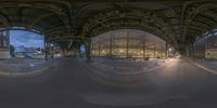 A fish-eye view of a train station in Berlin, Germany. Two trains can be seen underneath, with a clock tower in the background. The architecture and infrastructure create a symmetrical and urban design, illuminated by artificial light.