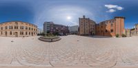 A classic brick building in Berlin's urban landscape. The large circular shape stands out among other brick structures. The open courtyard and straight alleyway create a unique urban design. Hard shadows from the clear sky add depth to the scene.