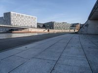 This is an image of a stone street adjacent to a canal in Berlin, Germany. The architecture of the large building with two sides facing the water reflects modern urban design. The clear sky serves as the backdrop for this urban landscape. The image showcases the vibrant city life and the connection between the city and the river. The stone pavers create a visually appealing surface along the canal. This photo represents the unique blend of modern architecture and urban charm found in Berlin, Europe.