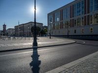 Sunny day in Berlin, Europe. Modern architecture casting hard shadows on urban asphalt roads. Clear skies highlight city life and urban design with the sun visible. A perfect blend of modernity and history.