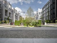 This image showcases a modern residential complex in the vibrant city of Berlin, Germany. The clear sky reflects off the sleek architecture of the buildings, embodying the urban design of the city. The photo captures a typical day in Berlin, where residents enjoy the perks of city life. The road and asphalt in the foreground lead to the residential area, surrounded by trees. This photo represents the perfect blend of modern architecture and urban living in Europe.