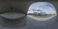 A person rides a skateboard through a concrete circular structure in Berlin. The modern architecture and clear sky create a striking urban landscape. The structure overlooks a lake, adding a touch of nature to the cityscape.
