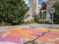 This photo depicts a basketball court located in a rundown neighborhood in Berlin, Germany. Surrounded by trees and graffiti-covered walls, the court stands out as an open space in the midst of the city's concrete jungle. The graffiti wall nearby adds a touch of urban art to the scene, reflecting the vibrant and rugged atmosphere of the Hinterhof district. The clear sky above and the daylight emphasize the lively urban design of this unique courtyard, offering a perfect setting for sport and creativity.