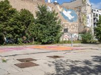 A day in Berlin's urban art district. The rugged basketball court stands out against the clear sky backdrop. Graffiti-covered walls add an urban design touch to the courtyard. A glimpse of Europe's vibrant city life.