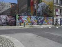 A grey day in Berlin, Germany showcases the city's classic architecture. The graffiti-covered facade adds an artistic touch to the urban landscape. A tree-lined road and residential buildings complete the picture of city life in Europe.