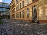 Classic architecture in Berlin's urban business district. Cobblestone streets lead to brick wall warehouses. European city life thrives in courtyards and open spaces. A glimpse of Germany's urban design and storerooms.