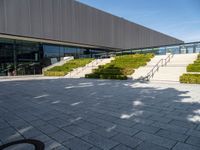 Modern architecture in Berlin, Germany. Large windows on each side of the building provide a view of the urban landscape. The stairs lead to an open space with carefully designed landscaping.