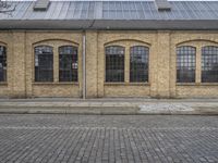 This image showcases the classic architecture of Berlin, Germany. The profile of a brick warehouse with symmetrical windows stands against the cloudy sky. The cobblestone road surface in front of the building adds to the urban design of the area. The brickwork and wooden fixtures contribute to the charm and character of the city. This photo captures the beauty of Berlin's architecture and the European aesthetic. It is a perfect representation of the blending of history and modernity in the urban landscape of Germany.