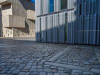 A modern office building in Berlin's business district, with hard shadows casting over the cobblestone courtyard. Urban design meets European architecture in this bustling cityscape.