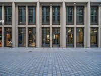 an empty brick courtyard area with two stone columns and two arched windows in the background