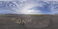 A wide fish-eye lens captures a straight road leading to an open space in Berlin. The runway is visible in the distance, surrounded by urban buildings. Clear sky and sunlight create a sunny city landscape.