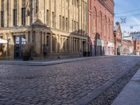 A classic architectural scene in Berlin, Germany. The cobblestone street leads to a yellow brick building with countless windows. Clear sky highlights the urban beauty. A perfect day to explore Berlin's classic architecture.
