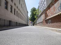 This stock photo captures the bustling cityscape of Berlin, Germany. A paved roadway, adorned with graffiti art, is surrounded by tall buildings. The architecture showcases classic European design. Cobblestone and asphalt roads lead through the neighborhood, creating a picturesque scene. The sun casts shadows, adding depth to the image. This vibrant urban setting is a prime example of the infrastructure and public spaces in this European city. The graffiti wall and courtyard in the backdrop further enhance the aesthetic appeal of the scene.