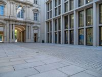 Modern architecture in Berlin's bustling business district. Urban design featuring office buildings and cafes. Open spaces contrast with the city's pavers. A blend of business and culture in Europe's vibrant city.