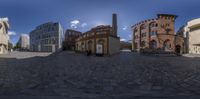 the sun shines on a cobble - stone street, as seen from a fisheye lens