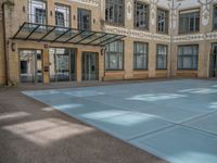 A classic brick wall warehouse in the heart of Berlin's urban landscape. Glass windows reflect the bustling city life. Open courtyard provides a tranquil open space amidst busy streets. A timeless example of European architecture.