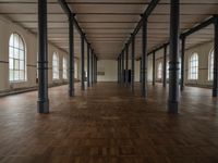This wide room in Berlin features classic architecture, with columns and windows covered in wooden planks and steel poles. The interior of this warehouse provides a spacious and open setting for various uses, such as storage, dancing, or even ballet practice. The natural daylight that floods the space during the day enhances the ambiance, making it ideal for both residential or factory settings. Explore the possibilities in this versatile space with its unique blend of classic aesthetics and modern functionality.