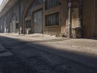 Abandoned factory in Berlin with classic architecture and lots of windows. A sign post on the street below reads 'No Parking', adding to the urban atmosphere. The sun casts shadows on the cobblestone road and the wall of the building.