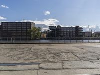 A modern architecture office building in Berlin, Germany. The cityscape features a plaza with an open space and a jetty on the river. Clouds fill the sky above the concrete and asphalt surfaces of the business district.