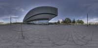 a panoramic view of a large building and its circular exterior space has a lot of glass windows