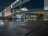 A night view of Berlin featuring an underpass, roads, and intricate modern architecture. Artificial light glows on wet asphalt near a canal. The urban landscape creates a reflective, mysterious atmosphere by the water.