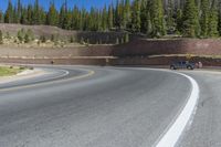 A scenic road in Berthoud Pass, Colorado. The asphalt curves through the picturesque mountain landscape. Clear skies provide a stunning backdrop for this nature-filled day in the USA.
