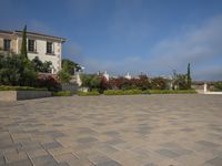 A large open driveway in California's Beverly Heights, surrounded by decorative plants and shrubs. Classic architecture of residential buildings in a suburban neighborhood. Clear sky adds sunshine to the picturesque scene.