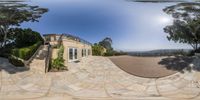 A stunning view of a house in Beverly Hills, California. The driveway is lined with lush trees, plants, and shrubs. The clear sky and the beautiful landscape create a serene and inviting atmosphere. A perfect place to call home.