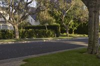 A sunny day in Beverly Hills, California, reveals a picturesque residential neighborhood. Purple flowers cover the road and extend to the sidewalk, adding vibrant spring colors to the suburban landscape.