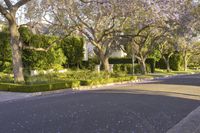 an empty street lined with trees covered in purple flowers next to a row of white houses