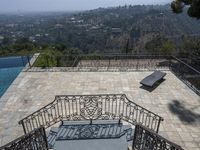 a balcony with a stone deck with a pool in the background, overlooking hills and a tree