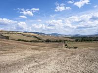 A person rides a bicycle across a dry field near the rugged mountains of Tuscany, Italy. The open space of the landscape provides a view of the clear sky and natural environment. This rural area is known for its picturesque beauty and bountiful harvests.