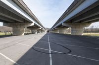 A view of a very big bridge from the side of the street in front of an empty parking lot. The road surface is made of asphalt and there is a parking deck nearby. The symmetry of the scene creates a visually pleasing composition.