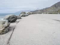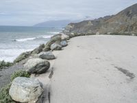 An overview of the scenic Big Sur coastline in California, USA. Grey sky contrasts with the coastal cliffs and rugged rock formations. The Pacific Coast Highway stretches along the shore, offering a straight down the road view of the ocean and sandy beaches.
