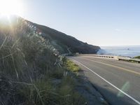 This is a beautiful image taken on the Pacific Coast Highway in Big Sur, California. The photo captures the stunning coastal landscape with a clear sky and sunshine. The road, lined with guard rails, winds alongside the ocean and the mountainous terrain. The sun is visible in the sky, casting a warm glow over the scene. This picture perfectly showcases the natural beauty of the California coastline, making it an ideal destination for nature lovers and road trip enthusiasts. Experience the breathtaking views and serenity of Big Sur and the Pacific Coast Highway.