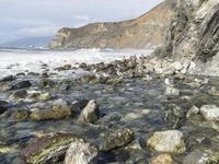 the water is clean and running near the rocks in the shallow water area of the beach