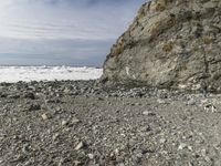 A stunning coastal landscape along the Pacific Coast Highway in Big Sur, California. The rugged cliffside offers magnificent views of the ocean. The rock formations and gravel surface add to the natural beauty of this open space.