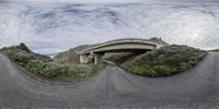 A road in Big Sur, California, curves along a rugged coastal bank under a grey sky. The overhang on one side provides an elevated view of the Pacific Coast Highway. Nature's beauty meets architectural infrastructure.