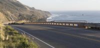 This image captures the scenic beauty of the Pacific Coast Highway in California, USA. The road, lined with guard rails and Armco barriers, hugs the cliffside and offers breathtaking views of the coastal terrain. The concrete bridge in the distance serves as a fixed link between land and water, adding to the infrastructure of the area. The grey sky adds a dramatic atmosphere to the landscape, making it a perfect day to explore nature along this iconic highway. This photo represents the vastness and natural wonder of California's coastline.