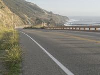 This is an image of a coastal road in Big Sur, California, USA. The road is lined with guard rails and surrounded by the natural beauty of the landscape. The asphalt road surface is visible, along with the low-lying fog that blankets the area. In the distance, the grey sky and ocean create a serene and atmospheric backdrop. This photo captures the iconic scenery of Big Sur and represents the scenic drive along the Pacific Coast Highway. Experience the beauty of California's coast with this stunning image.