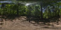 there is a man riding a bike in a forest of trees and sand with a frisbee